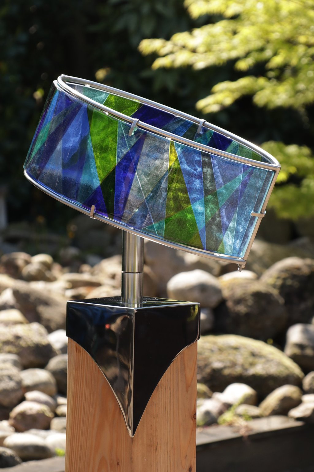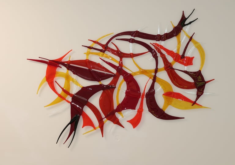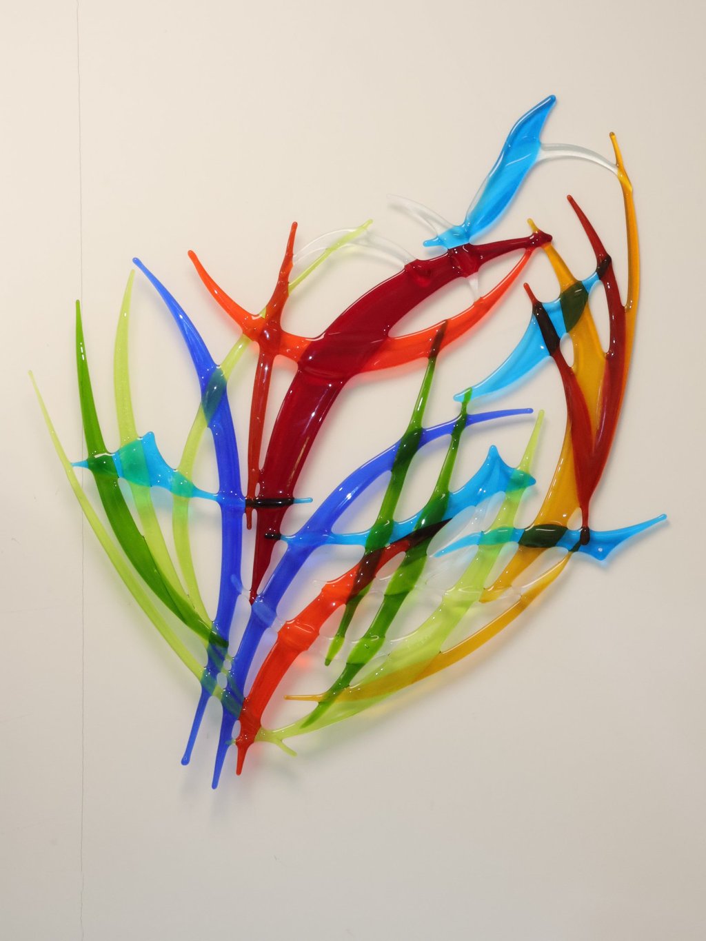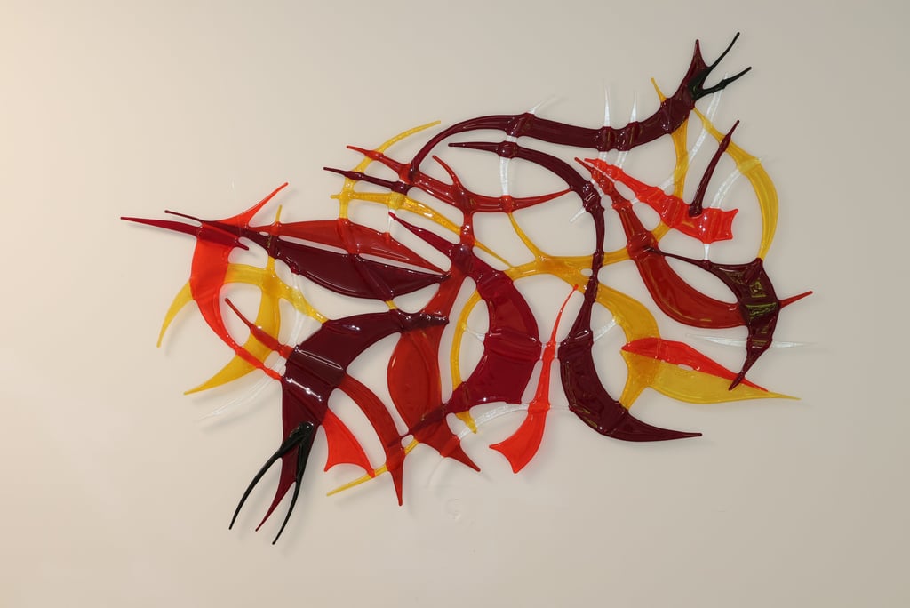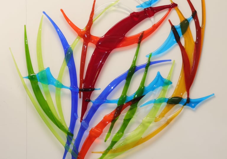 Uit vele driehoeken glas worden objecten opgebouwd, die aan caleidoscopen doen denken.